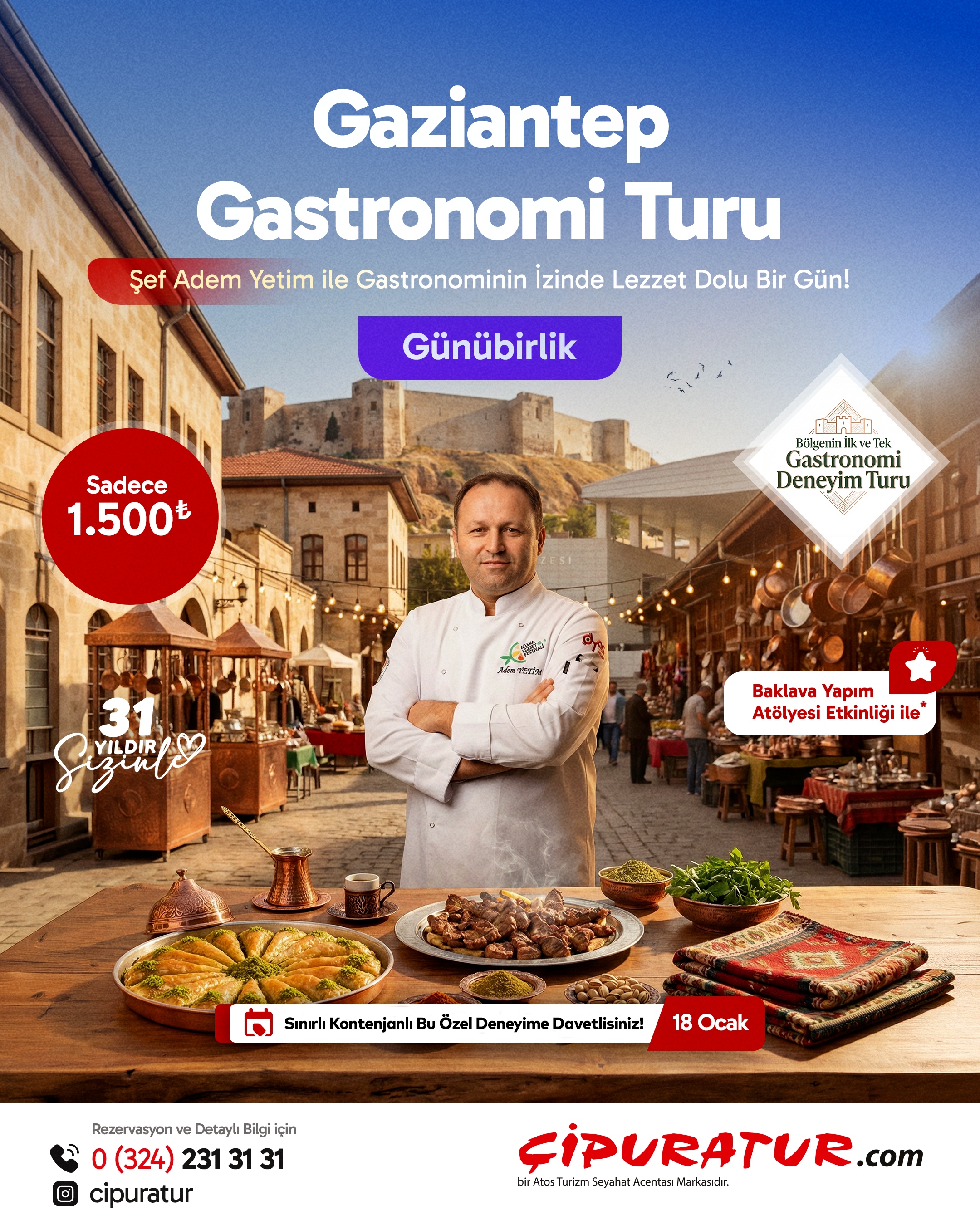 Gastronomi Deneyimi Turu; katılımcıların yalnızca yemek tatmasını değil, lezzetin üretim sürecine aktif olarak dahil olmasını amaçlayan özel bir deneyim turudur. Baklava Yapım Atölyesi’nde ustalar ile Şef ve Akademisyen Adem Yetim eşliğinde farklı baklava çeşitlerini birlikte hazırlıyor; hamur açımından şerbetleme aşamasına kadar süreci uygulamalı olarak öğreniyor ve hazırlanan baklavaları yerinde tadıyoruz. Gün boyunca gerçekleştirilen duraklarla da Gaziantep mutfağını, kültürü ve gastronomi mirasını şef anlatımıyla deneyimliyoruz.