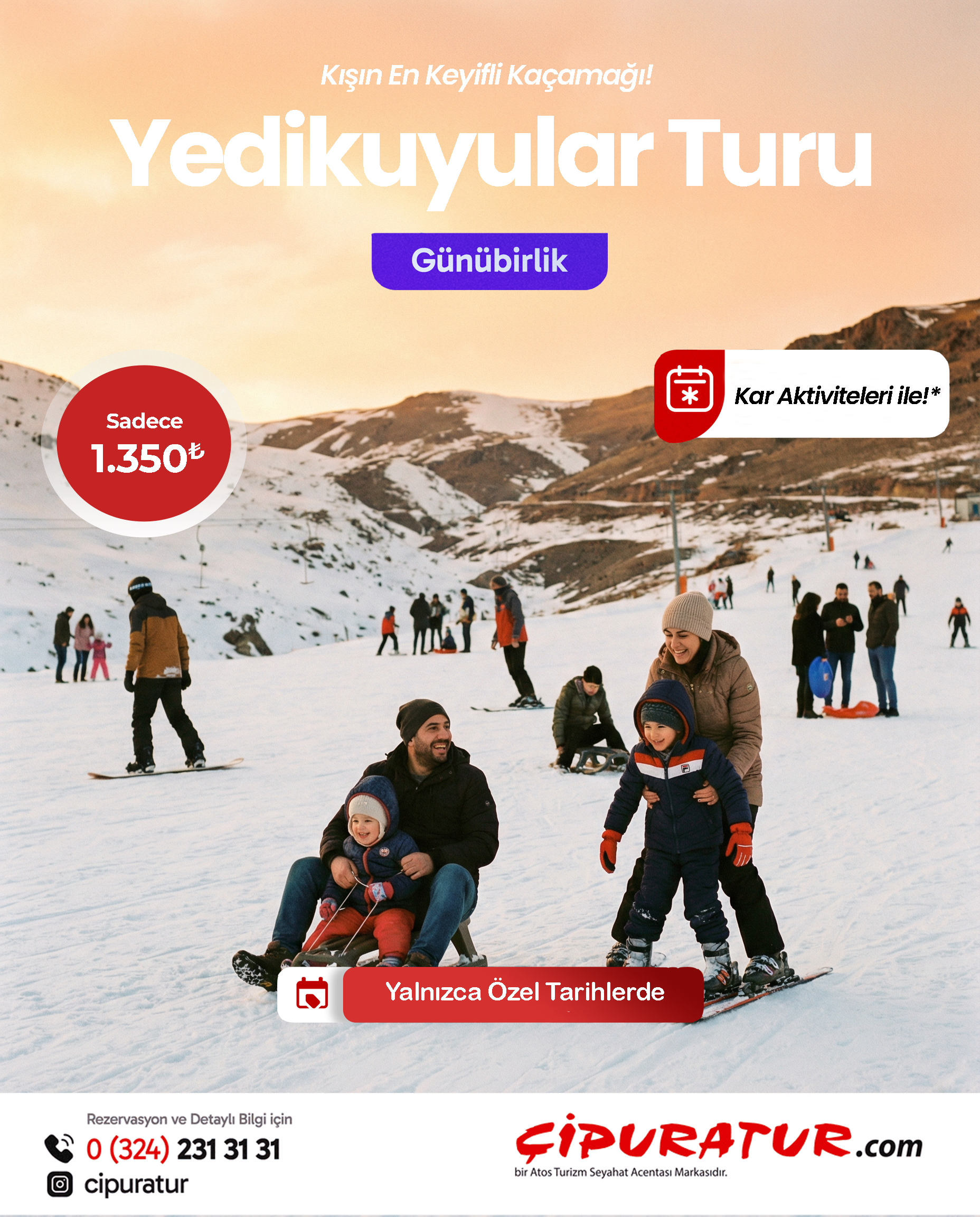 Varışımızın ardından Kahramanmaraş’ın en önemli kış turizm merkezlerinden biri olan Yedikuyular Kayak Merkezi’ne ulaşıyoruz. Burada misafirlerimize, doğayla iç içe ve tertemiz dağ havası eşliğinde gün boyu değerlendirebilecekleri serbest zaman veriyoruz. Dileyen misafirlerimiz kayak, snowboard ve kızak aktivitelerine katılabilir, dileyenler zirve manzarası eşliğinde yürüyüş yapabilir ya da tesis alanındaki kafelerde sıcak içeceklerini yudumlayarak kış atmosferinin tadını çıkarabilir. Kar manzarası eşliğinde bol bol fotoğraf çekme imkânı da bulacağımız bu keyifli molanın ardından Yedikuyular’dan ayrılarak Kahramanmaraş şehir merkezine hareket ediyoruz.