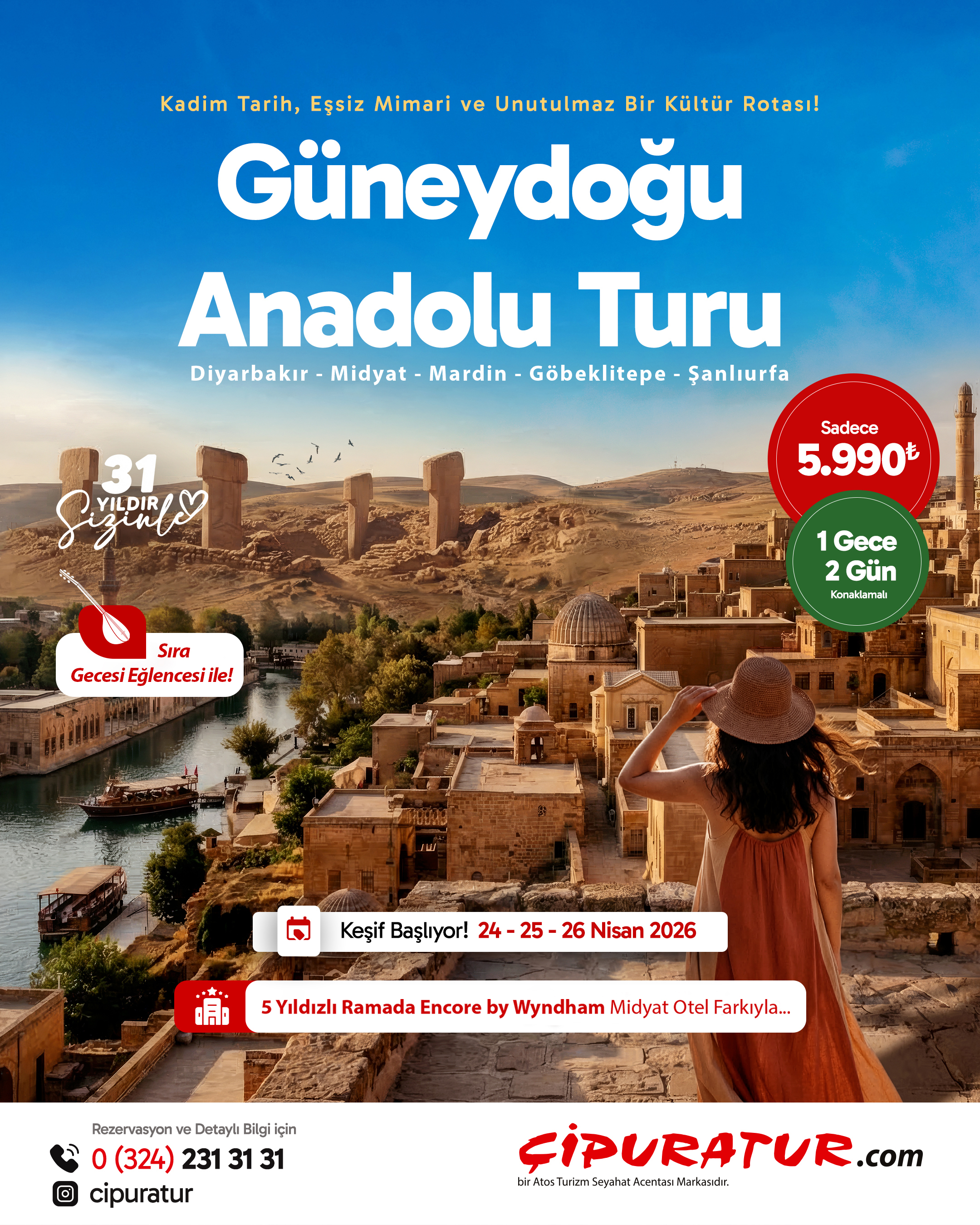 Verilen molalar eşliğinde yolculuğumuzun ardından uygun bir tesiste kahvaltımızı alıyor ve gezimize başlıyoruz. İlk durağımız, Anadolu’nun en önemli tarihi şehirlerinden biri olan Diyarbakır… İslam dünyasının en eski camilerinden biri kabul edilen Diyarbakır Ulu Camii, tarihi atmosferiyle ünlü Hasan Paşa Hanı, geleneksel dokusunu koruyan Diyarbakır Çarşıları, Dicle Nehri üzerinde zarif mimarisiyle uzanan On Gözlü Köprü, Atatürk’ün Diyarbakır ziyaretlerinde konakladığı Gazi Köşkü, şehrin sembollerinden Dört Ayaklı Minare, kervanların konaklama noktası olan Deliler Hanı, ünlü şairimizin hatıralarını yaşatan Cahit Sıtkı Tarancı Evi ve UNESCO Dünya Mirası Listesi’nde yer alan Diyarbakır Surları gezilerimizi gerçekleştiriyoruz.
