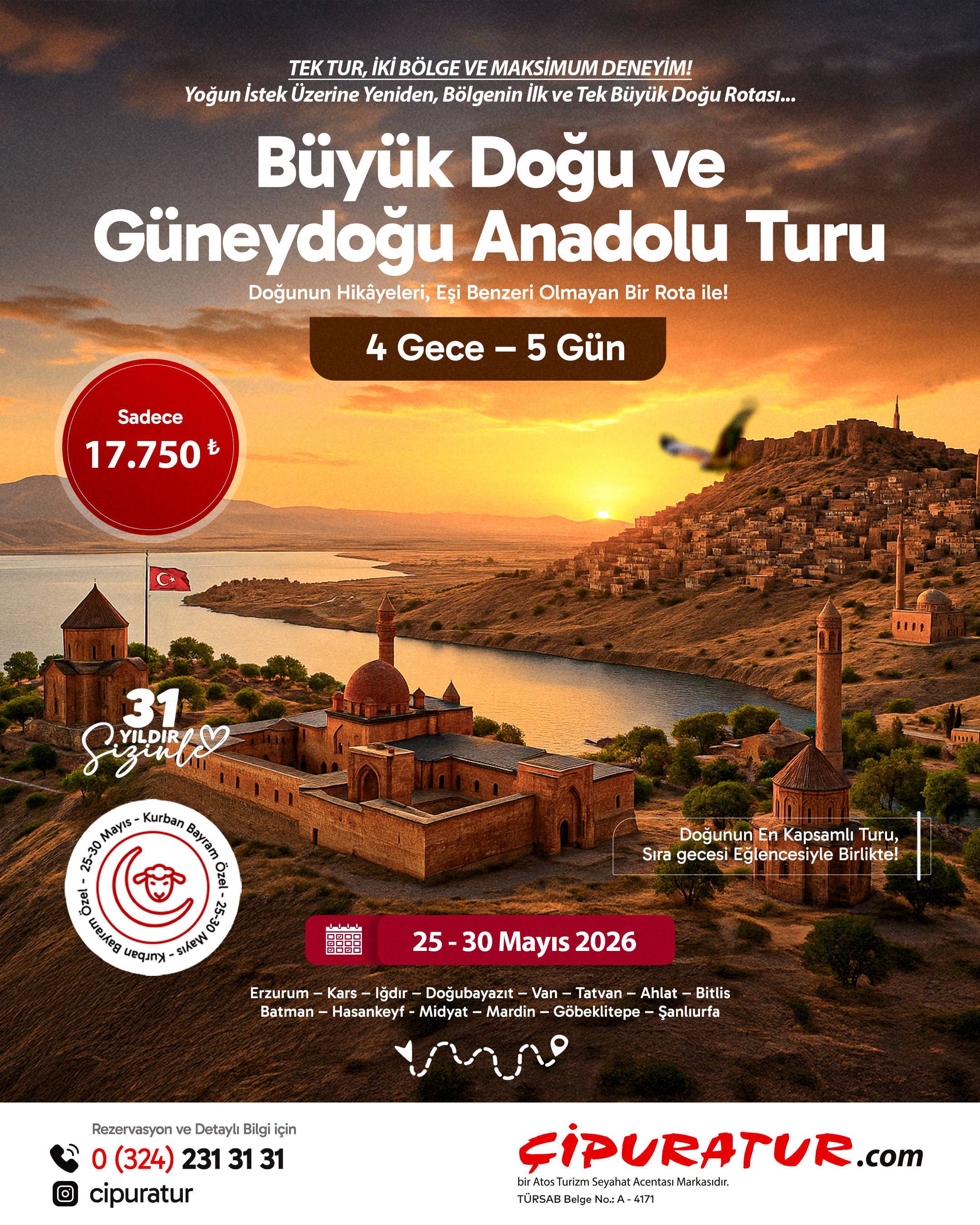 - Van Gölü’nün maviliği eşliğinde Muradiye Şelalesi’nin serinliğini hissedecek, Akdamar Adası’nın efsanelerini dinleyecek; Nemrut Krater Gölü’nden Hasankeyf’e doğanın büyüsüne kapılacak, Midyat, Mardin ve Şanlıurfa sokaklarında taş mimarinin gölgesinde tarihle iç içe yürüyeceksiniz. Göbeklitepe’de medeniyetin izini sürecek, Balıklıgöl ve sabır makamında huzurun derinliğini yaşayacaksınız.
